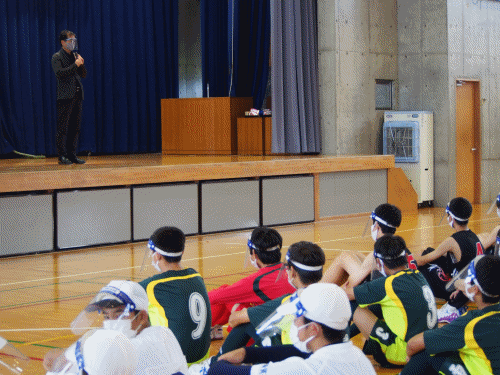 2020年9月18日 15時30分フィジカルディスタンス、入退出時の手指消毒、フェースシールド、マスク併用の対策のもと全校生が体育館に集まり、中体連岩瀬支部新人総合大会と県中体連駅伝競走大会に向けて選手壮行会を行いました。応援団以外は、大きな声を出す声援を避け、大きな拍手で応援の気持ちを表しました。全校生が体育館に一堂に会したのは、今年度初です。今後の学校行事の工夫・改善にも役立てていきたいと思います。