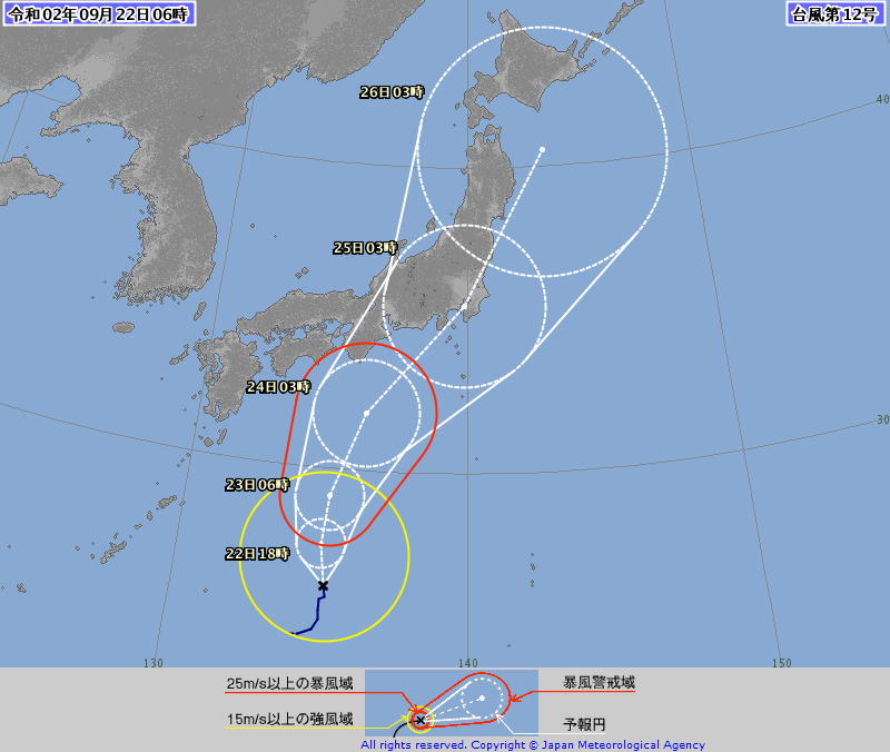 2020年9月22日 07時00分気象庁によりますと、台風12号は日本の南の海上を北寄りに進んでいます。今後の最新の気象情報にご注意ください。