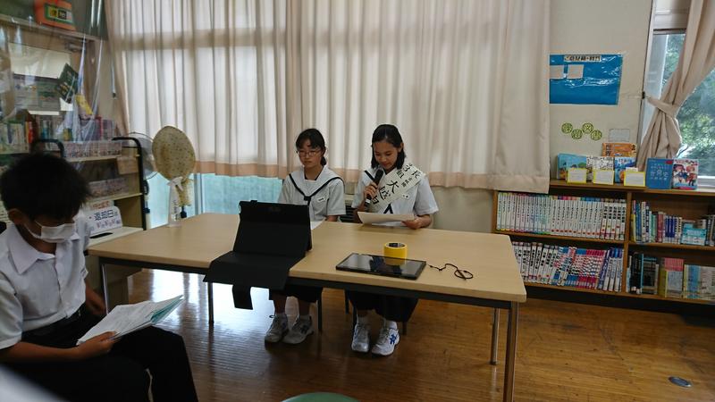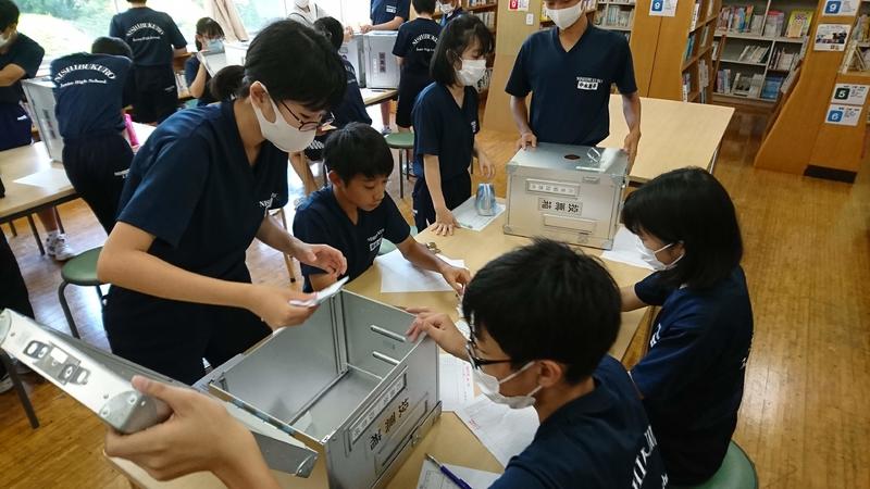 2020年9月3日 15時30分次代を担う生徒会役員を選ぶ生徒会役員選挙立会演説会がWeb会議システムを活用して図書室と各教室を結んで行いました。「よりよい西中」にするために各立候補者の立候補の動機や抱負について音声とともに映像を通じて各教室に届けられました。本番の国政選挙等で使用する本物の投票箱を貸し出してくださった須賀川市選挙管理委員会の関係者の皆様にも感謝を申し上げます。