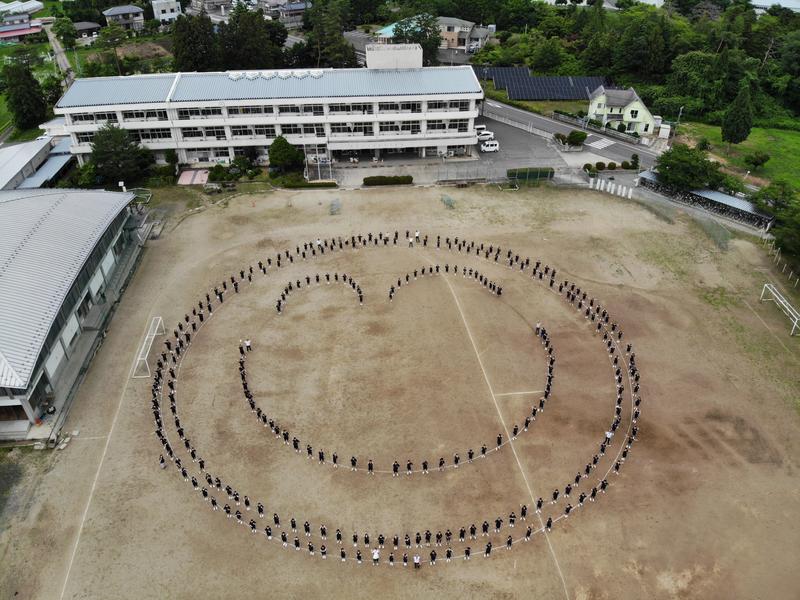 2020年7月31日 12時00分校庭に全校生の満開の笑顔が咲きました!