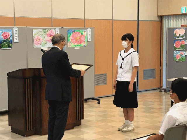 2020年7月1日 18時30分本日、 牡丹会館で 「第19回牡丹絵画展」 の表彰式が行われました。今年は市内小中学校から159点 の応募があり、 観光物産振興協会長賞に本校2年 曽我 綾音さんが入賞し表彰されました。