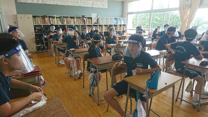 2020年7月3日 14時00分各教科等に共通する活動として「生徒が長時間、近距離で対面形式となるグループワーク等」及び「近距離で一斉に大きな声で話す活動」の際、感染リスクをより低減させるために全校生にフェイスシールドを配付しました。授業形態に応じて活用していきたいと思います。