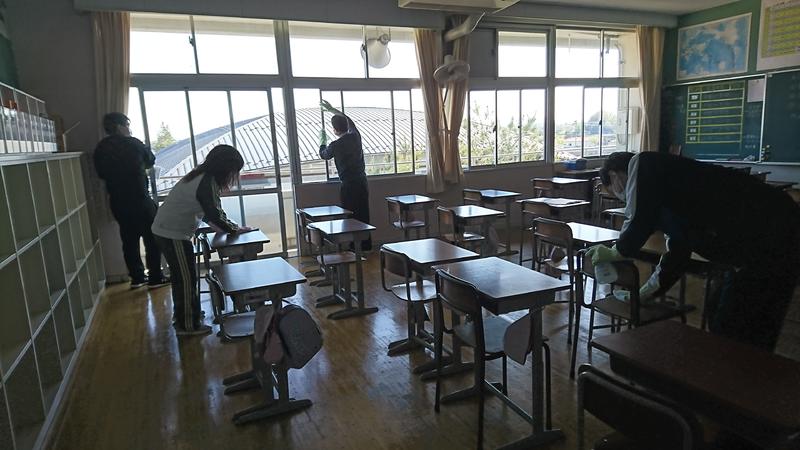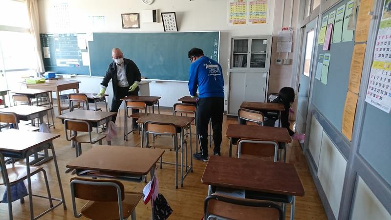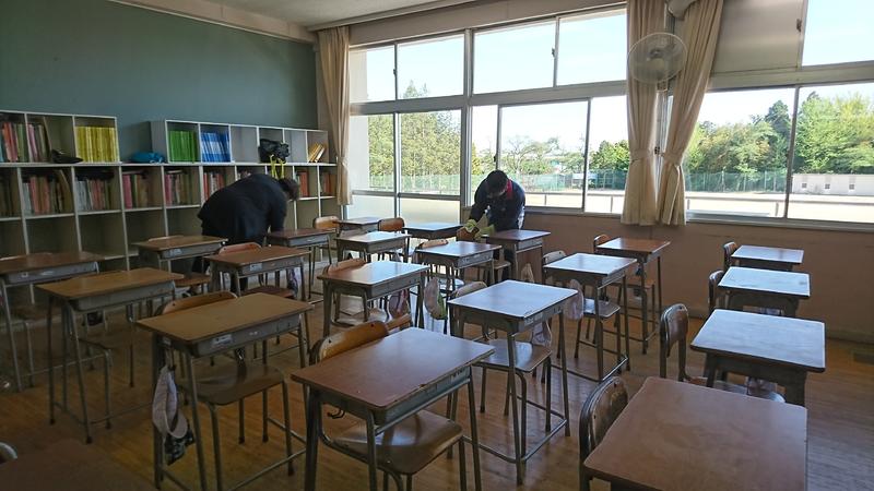 昨日の放課後、新型コロナウイルス感染症防止対策として、教室内の机、椅子、校舎内のドアノブ、電気スイッチなどの設備等について消毒作業を行いました。