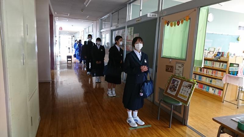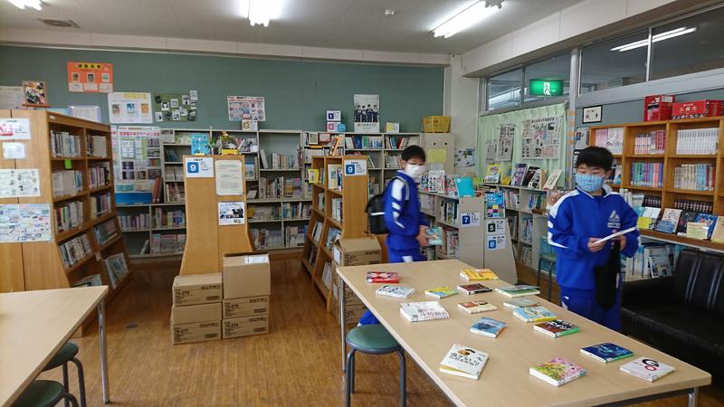 2020年4月27日 14時00分 臨時休業中ですが、学年毎に時間差をとって図書室の本の貸し出しを行いました。混雑時は、廊下でフィジカル・ディスタンシングを実施しました。来校した生徒の皆さん、協力してくれてありがとうございました。