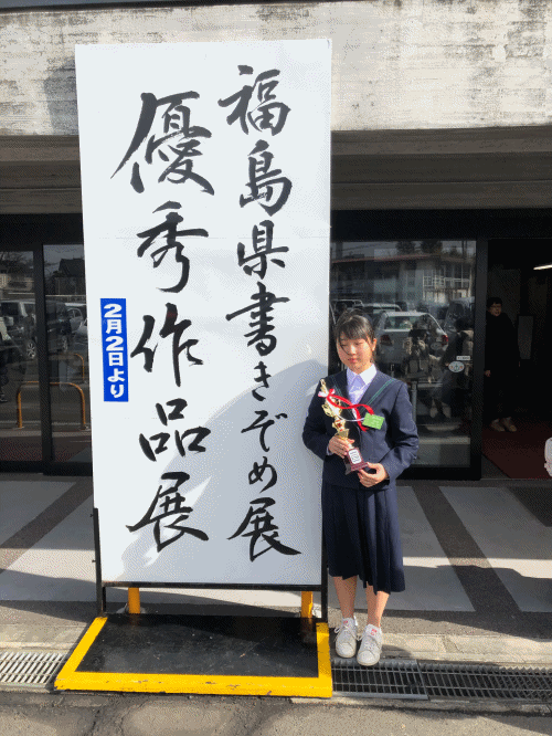 2020年2月10日 10時00分小・中学校国語科書写・高等学校芸術科書道の正しい伸展をはかるため、福島県内の小・中・高・特別支援教育諸学校児童・生徒を対象に第64回福島県書きぞめ展が開催され、本校2年 古和田桜華さんが「書きぞめ賞」に入賞し、福島市の福島県教育会館で行われた表彰式で賞状とトロフィーを頂きました。また、団体賞として「学校賞」もいただきました。
