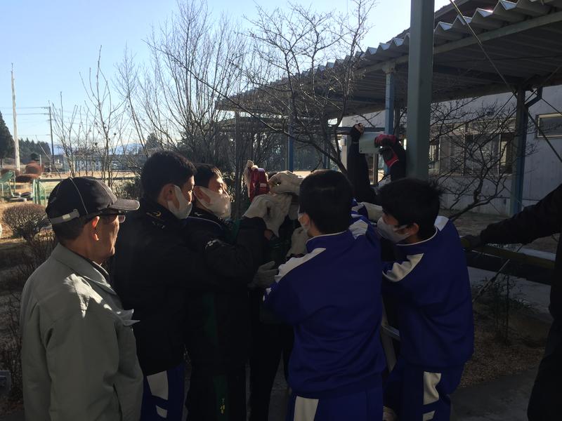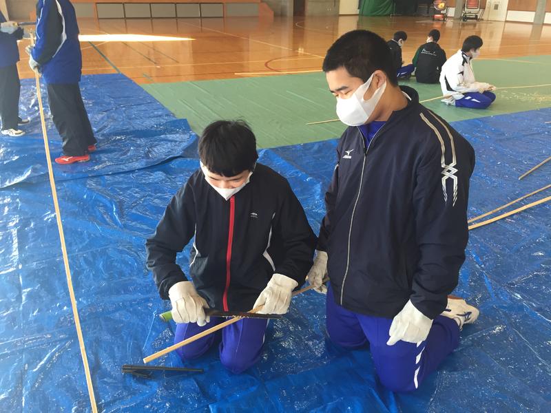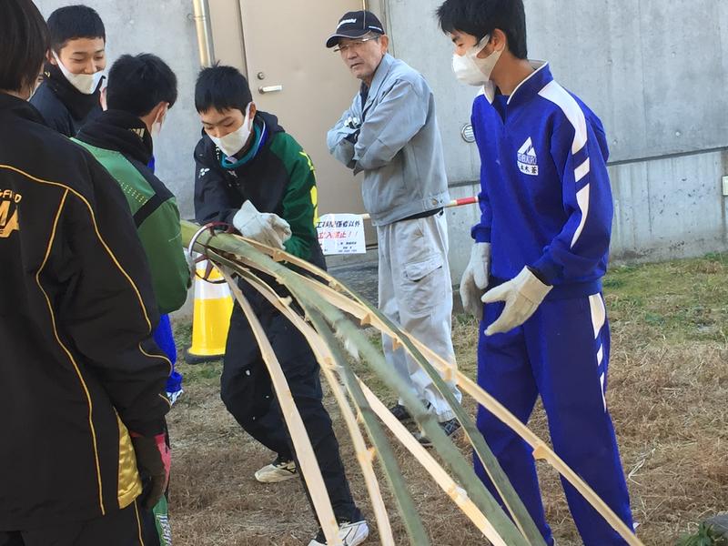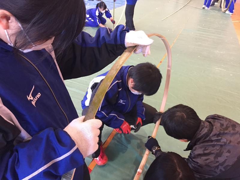 2019年12月25日 13時30分本日、サッカー部、バレー部、卓球部とボランティアの2年生が中心となり、特別非常勤講師の小貫先生のご指導のもと、来年の松明あかしに向けて「たがづくり」を行いました。たがとは、 竹を割き、編んで輪にしたもので、桶(おけ)、樽(たる)などの外側にはめて締めかためるのに用いるものです。