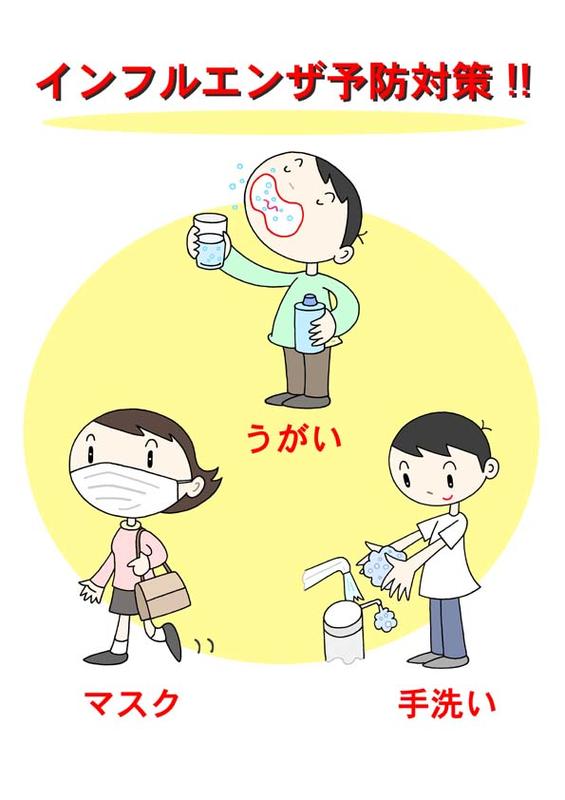※手洗いは手や指などに付着したインフルエンザウイルスを物理的に除去するために有効な方法であり、うがいも口の中に入ったインフルエンザウイルスを洗い流すのに大変効果があります。外出後の手洗い・うがいは、感染症の予防の基本です。学校でも繰り返し指導しますが、ご家庭でもよろしくお願いします。