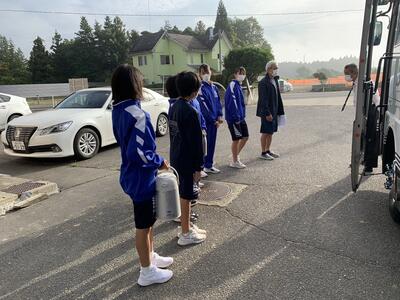 2021年10月5日 07時36分本日(4日)行われます県中体連駅伝大会(楢葉町総合グランド競技場で実施)に向けて、本校女子駅伝部7名が元気に出発しました。朝の時間や短い放課後の時間を有効活用しながら常設部との活動を両立し、一生懸命頑張ってきました。今までのBESTの記録が更新できるよう期待しています。西中Fight!!