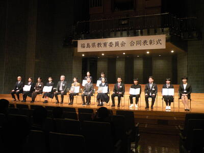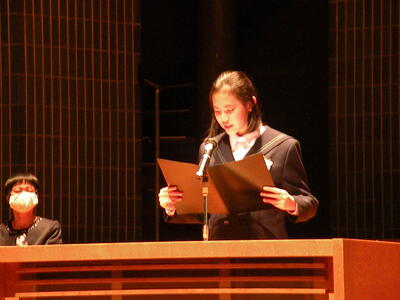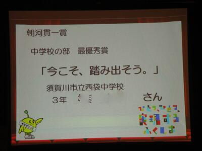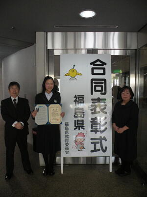 2022年1月5日 14時40分表彰式後は、各賞受賞者の発表が行われました。本校の女子生徒も立派な態度で堂々と発表することができました。その後、記念写真撮影が行われました。式終了後、県教育委員会の先生方や他の学校の校長先生より祝福のお声掛けをたくさんいただきました。今日の表彰式にはご両親も参加されました。3年生の高校受験前にすばらしい賞をいただき、今後の本校並びに3年生全体の励みになります。次の主役は君たちです!!
