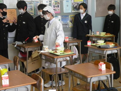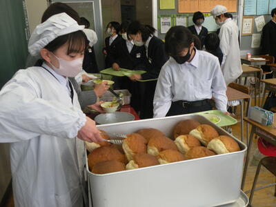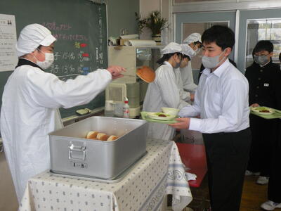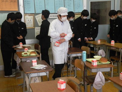 2022年12月22日 12時50分今日のメニューは、丸コッペパン・煮込みハンバーグ・ボイル野菜(ハンバーガーに変身)・白菜スープ・牛乳でした。今日も美味しくいただきました。2学期最後の給食、1年生の教室の訪問しました。みんなしっかりしてきましたね!