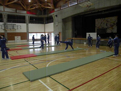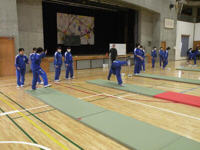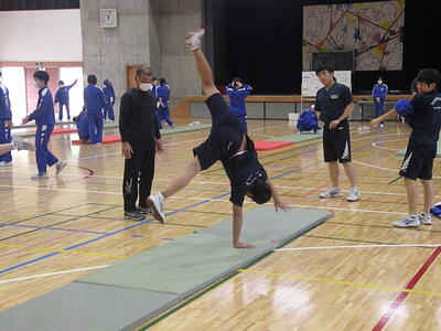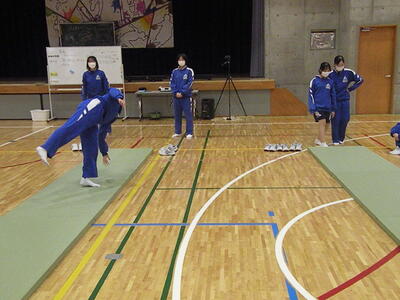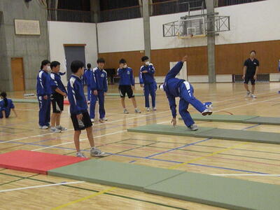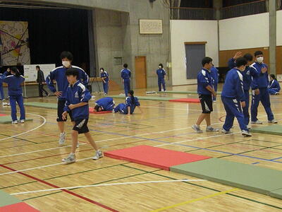 2023年11月7日 13時50分柔道の授業の前に畳の上での前転・後転・側転・開脚前転など身体の柔軟性を高める運動を行っていました。受け身をとるうえでも、手の付き方や頭や首に負担のかからないような手段を身につけることが大事です。