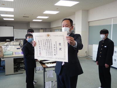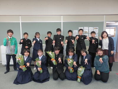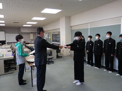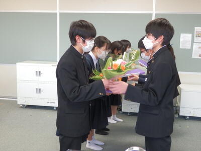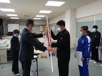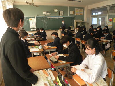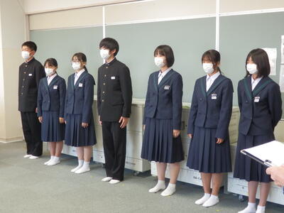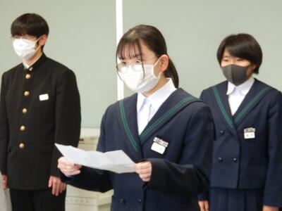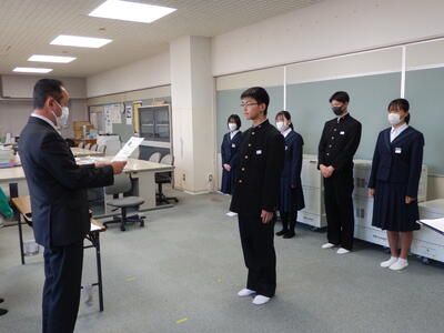 2022年11月18日 16時20分体育館が使用できないため、コンピュータ室でリモート形式で行われました。始めに表彰伝達、次に専門委員会委員長並びに学級委員の任命式、最後に生徒会役員新旧の引き継ぎ式が行われました。旧生徒会役員の生徒たち一人ひとりの挨拶がとても立派でした。新生徒会役員の活躍もこれからとても楽しみです。よろしくお願いいたします。