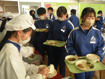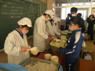 2022年11月21日 11時55分今日のメニューは、麦ごはん・鶏肉の香味焼き・ごま和え・沢煮椀・牛乳でした。今週も美味しい給食、ありがとうございます。今日は3年生の教室を訪問しました。準備が早く、手際よく進められていました。