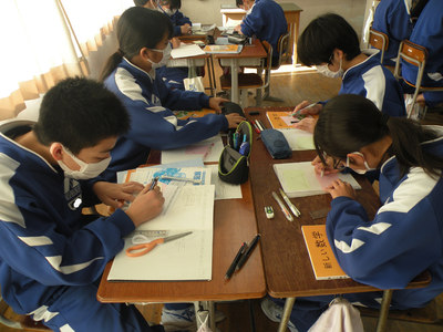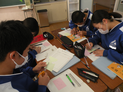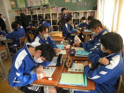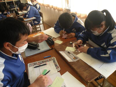 2022年11月22日 11時40分多角形の外角の和について紙に記入し、はさみで不要なところを切り捨ててしまう作業中でした。分からないところは先生や班員に聞きながら進めていました。今日は須賀川市教育委員会の先生も参観に来ていただきました。紙を使うことにより、より理解できたものと思いました。