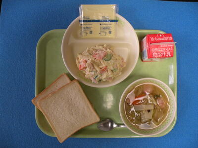 2022年11月22日 13時40分今日のメニューは、食パン・えびボールスープ・ポテトサラダ・スライスチーズ・牛乳でした。今日はちょっと肌寒いので、スープはとても体が温まりました。すみません、今日は所用で教室は回れませんでした。