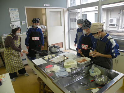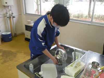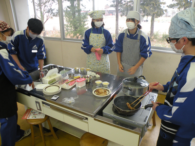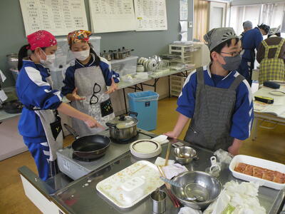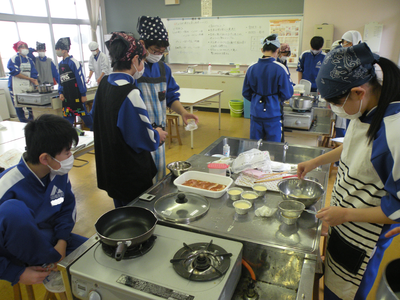 調理実習が行われています。メニューは生姜焼きとプリン(蒸し物)です。調理室に入るなり、いいにおいが漂っていました。男子生徒もフライパンを持っての焼き方や洗い物に精を出していました。調理室はガスですが、生徒たちの家庭はIH対応が多くなってきているようです。
