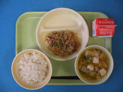今日のメニューは、麦ごはん・チャプチェ・ボータンキムチスープ・牛乳でした。今日は1年生の教室を訪問しました。2組は調理実習の後で、食べられるかな?上手にできたようです!!