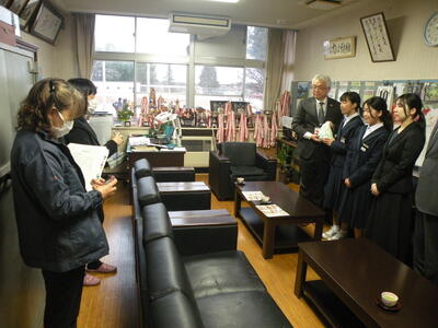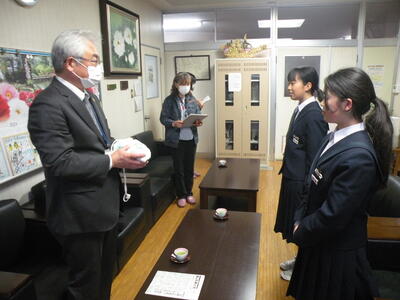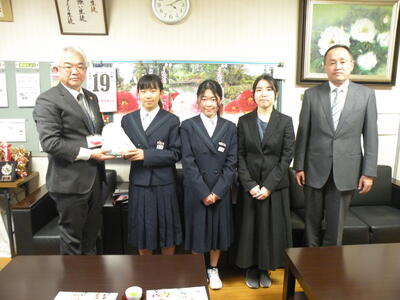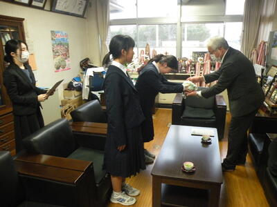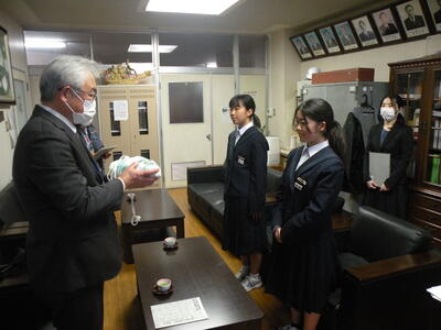 本校、校長室において「赤い羽根協同募金の贈呈式」を行いました。市の社会福祉協議会の方々にお出でいただき、奉仕委員会の委員長と副委員長(共に2年生)、顧問の先生が参加しました。高額な金額ではありませんが、今後社会福祉関係にご活用いただければと思います。お忙しい中、ありがとうございました。