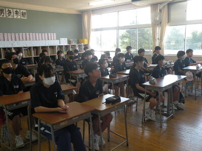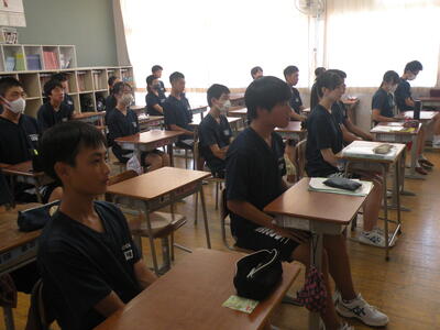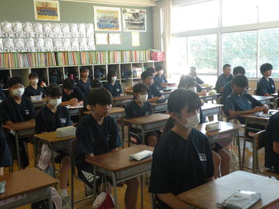 2023年8月25日 10時25分放送での始業式を行いました。校長挨拶・各学年代表生徒の発表・生徒指導の先生からと行われました。各学年・各教室で真剣な態度で話を聞くことができました。2学期も頑張りましょう!