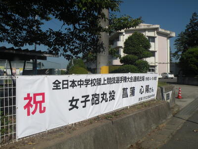 2023年7月28日 07時40分女子砲丸投げの2年続けての全国大会出場の横断幕が掲げられました。この横断幕は本校PTA並びに、体育文化後援会のご協力のもと作成されました。ありがとうございました。更なる活躍が期待されます。