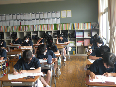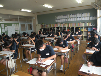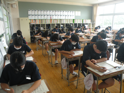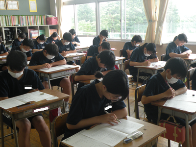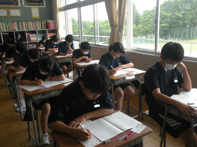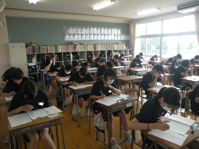2023年7月19日 11時10分2年生のテストの様子です。みんなすごい集中力です。現在、3教科目の英語です。最後まで全力で取り組んでくださいね!