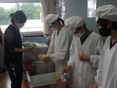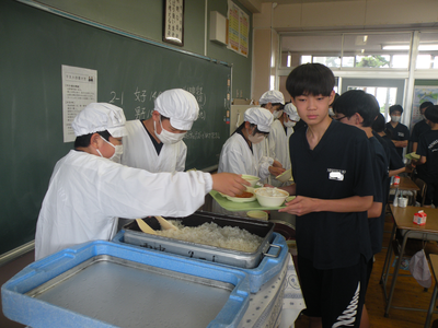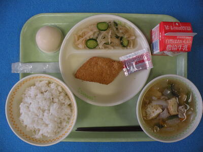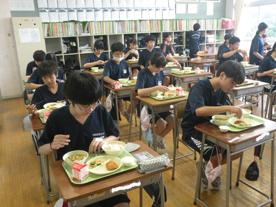 2023年7月19日 13時00分今日は今学期最後の給食でした。メニューは「食育の日献立」であり、麦ごはん・カジキカツ・パックソース・夏野菜のみそ汁・ピリ辛和え・桃プリン・牛乳でした。カジキカツ、普段なかなか食べられません。とても美味しかったです。今日は2年生の教室を訪問しました。調理員の皆さん、1学期間、美味しい給食をご提供いただきありがとうございました。