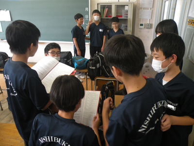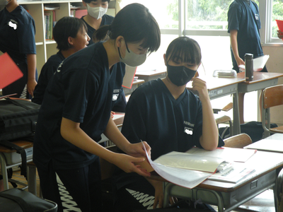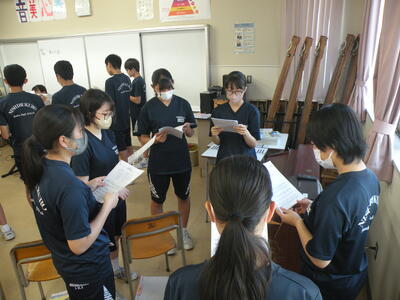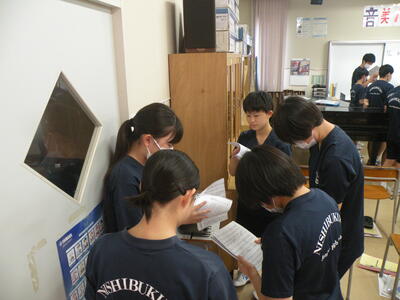 2023年7月20日 09時20分3年1組の音楽の授業です。今学期最後の授業となりました。合唱コンクールの曲目も決まり、3つのパートに分かれての練習でした。女子生徒は意欲的でしたが、男子生徒は少し恥ずかしさを感じているようでした。本番に向けて、すてきなハーモニーを奏でてくださいね!