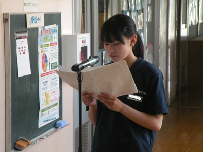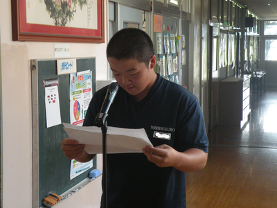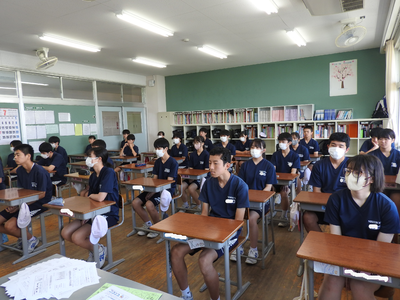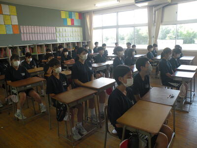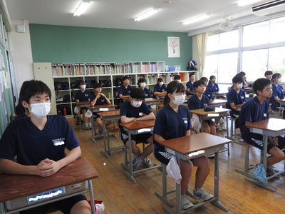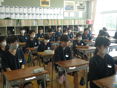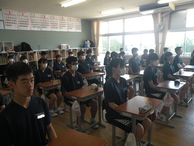 2023年7月20日 10時45分本日は1学期の終業式です。本校では暑さ対策から放送で行い、各クラスで話を聞くような形で進めました。校長式辞・各学年代表生徒の発表の順で行われました。1学期72日間、たいへんにお世話になりました。そして、明日から迎えます35日間の夏休みも、無事故で充実した生活が送れるようよろしくお願いいたします。