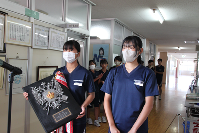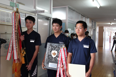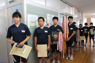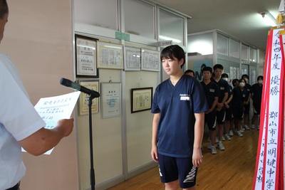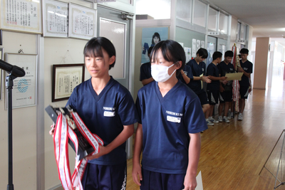 2023年7月20日 11時40分終業式終了後に、表彰伝達式を行いました。県陸上大会、県中地区野球・ソフトテニス(団体・個人)、たいへんにすばらしい成績でした。おめでとうございます。これから迎える県・東北・全国大会での更なる活躍を期待しています。