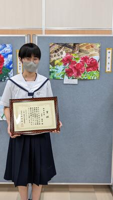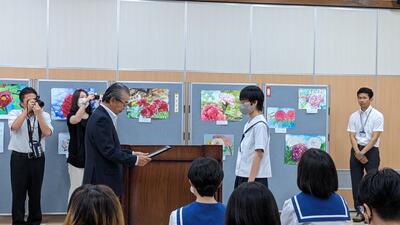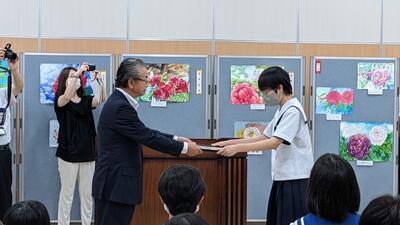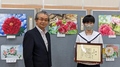 2023年7月21日 08時30分昨日の午後、牡丹絵画展の表彰式が牡丹会館で行われました。すでにご紹介済みではありますが、本校の2年生女子生徒が最高賞である理事長賞を受賞しました。この生徒は昨年度は教育長賞を受賞しており、2年続けての快挙となりました。受賞、誠におめでとうございます。
