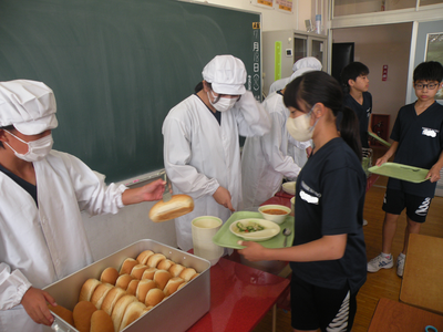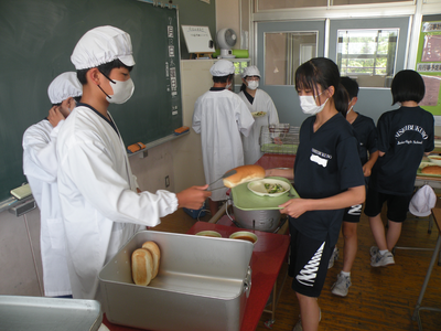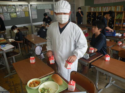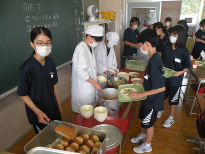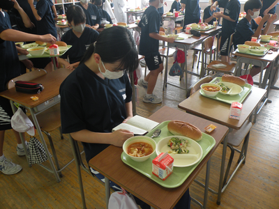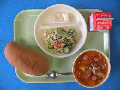 2023年7月18日 13時00分今日のメニューは、コッペパン・はちみつ&マーガリン・カラフルサラダ・豆とソーセージのトマトスープ煮・牛乳でした。今学期の給食も今日と明日だけです。よく味わって食べてくださいね。今日は1年生の教室を訪問しました。みんな大きく成長した様子が伺えました。