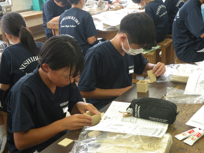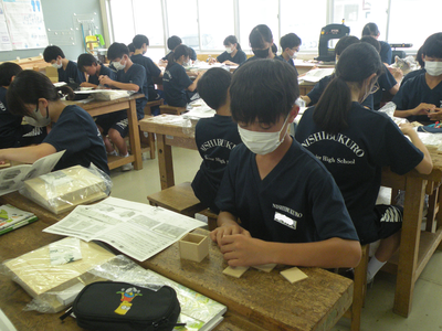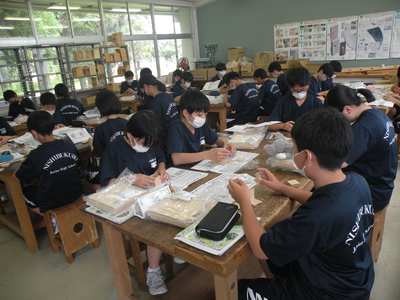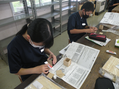 2023年7月18日 14時30分隣の人に聞きながら、板を組み合わせていました。最後にボンドで粘着して完成です。本立て作りの前段であり、いよいよ次の時間からは本格的にスタートするのかな?