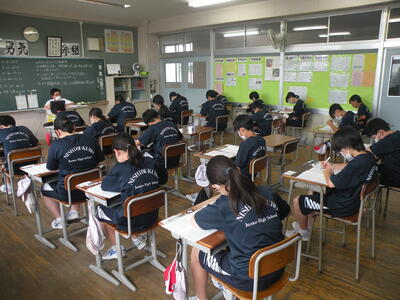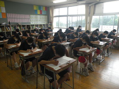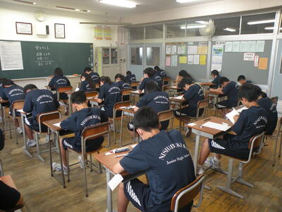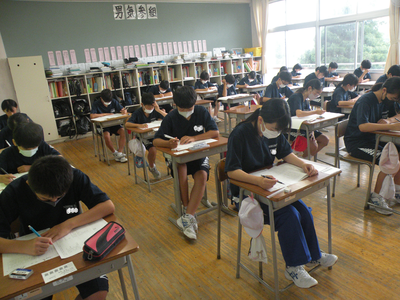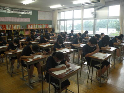 2023年7月19日 09時00分5教科の実力テストが行われています。1年生にとっては初めてのテストとなります。1学期、各教科どのくらいの力が身に付いたかを知るテストでもあります。最後まであきらめずに頑張ってほしいと思います。