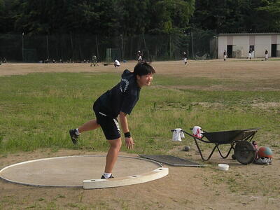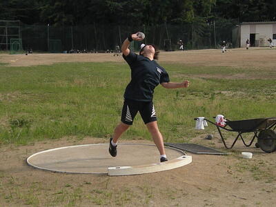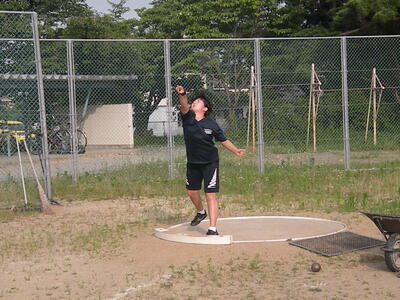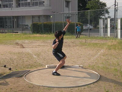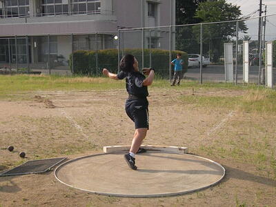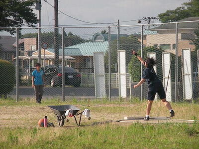 2023年7月19日 10時05分女子砲丸投げで東北・全国大会に出場する選手です。暑い中、顧問の先生との二人三脚で練習に打ち込んでいます。3年間の思いや頑張りを砲丸に込め、会心の一投を期待しています。頑張れ!!
