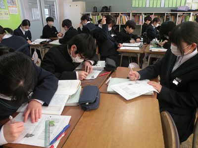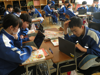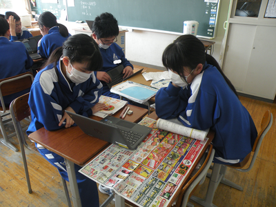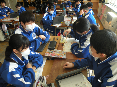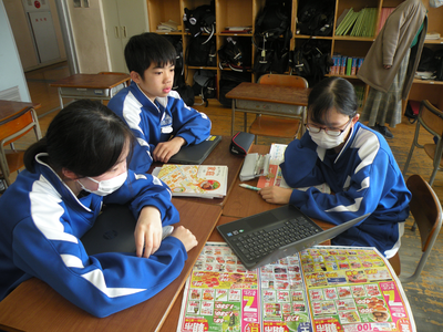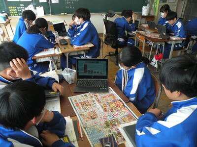 1年1組の家庭科の授業です。タブレットやスーパーのチラシを使用しながら、食品について調べることができました。