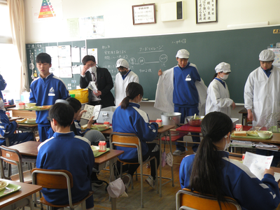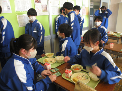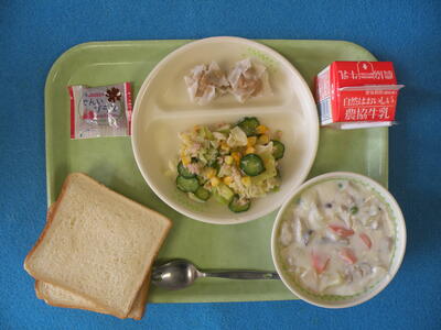 今日のメニューは、食パン(いちごジャム)・クリームシチュー・黒豚シュウマイ(2個)・春キャベツのサラダ・牛乳でした。今日は1,2年生の教室を訪問しました。次の学年への準備は着々と進んでいるようです。