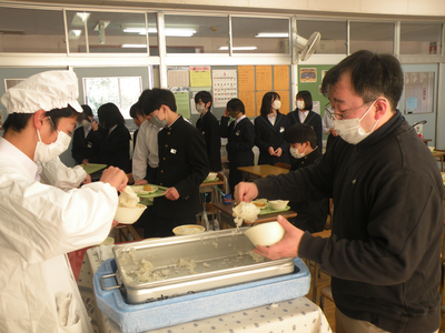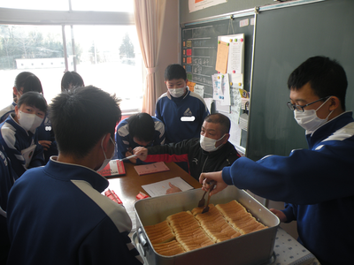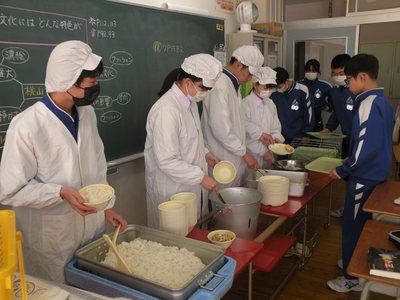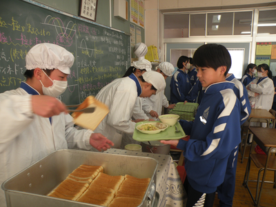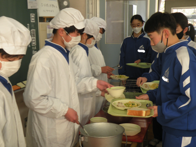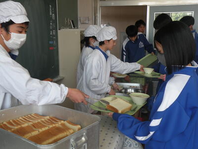 今日のメニューは、二色パン・ポークウインナー(ケチャップ付)・コーンサラダ・玉子スープ・牛乳でした。1,2年生全教室を訪問させていただきました。今学期の給食は今日で終了です。1年間、調理員の皆さんには美味しい給食をご提供いただきまして、ありがとうございました。