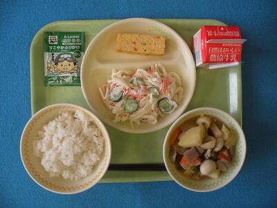 今日のメニューは、麦ごはん・厚焼玉子・関東煮・ふりかけ・大根サラダ・牛乳でした。今日も全教室を訪問しました。みんな元気でした!