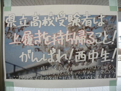 2024年3月6日 06時50分6時30分頃に出勤しましたら、通学路である歩道と校舎周辺がきれいに除雪されていました。もうすでに除雪をされた方の姿はありませんでした。早朝より本当にありがとうございました。3年生教室を覗くと黒板にメッセージが書かれていました。本日受験の生徒は頑張ってくださいね。本当に心優しい西中生です。学校や地域の誇りです!!