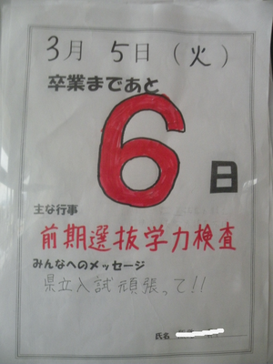 2024年3月5日 06時50分今日から3日間、県立高校前期選抜試験が行われます。(受験高校によって日程は変わります。)平常心で、いつものように取り組めば大丈夫です。自信を持って臨んでください。受験生全員の頑張りを期待しています。