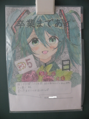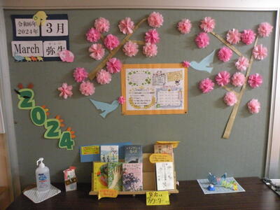 2024年3月5日 17時00分学校司書の先生が毎月、季節感溢れる掲示物を作成しております。生徒も教職員もいつも心癒やされています。3年生はこの掲示物が中学校最後のものになります。
