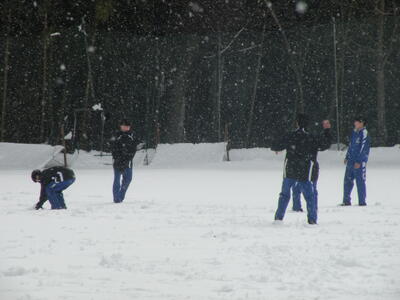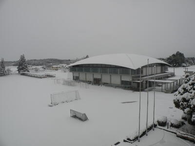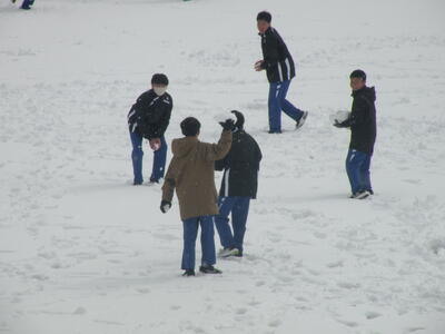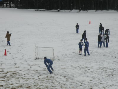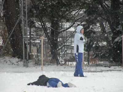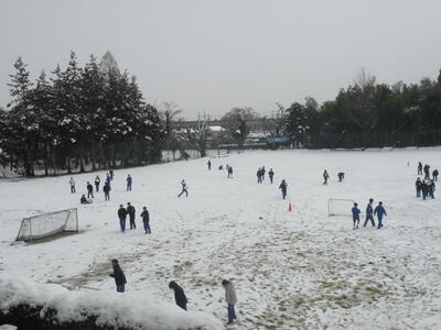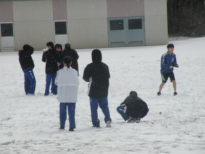 雪の中、生徒たちは元気に走り回っています。