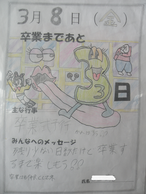 2024年3月8日 09時30分第44週の主な行事は、13日(水)の卒業式が行われます。そして、翌日は県立高校前期選抜試験の合格発表です。3年生の皆さんは、来週の3日間でお別れです。寂しさだけしかありません・・・