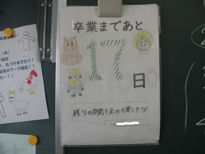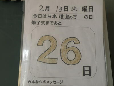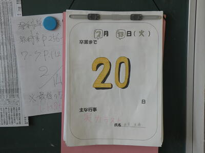 2024年2月13日 10時30分中学校最後の実力テストが行われています。各教室には卒業・修了式までの日数が掲示されていました。卒業・進級の季節、もう春ですね!