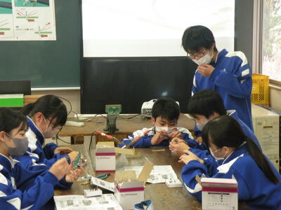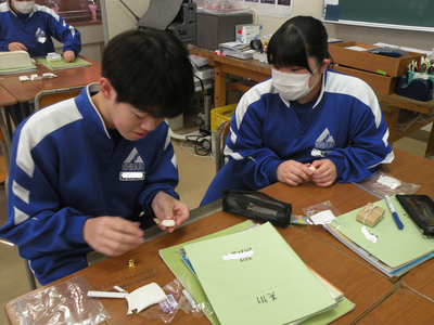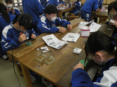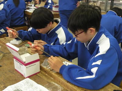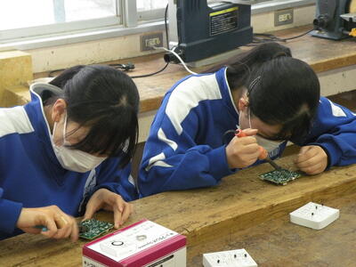 2024年2月1日 11時55分2年生の技術の時間では多機能生ラジオの製作が行われています。部品を基盤にはんだで取り付ける作業です。もしもの時の防災にも使用できるものです。今から完成が楽しみです。女子生徒もとても上手です。