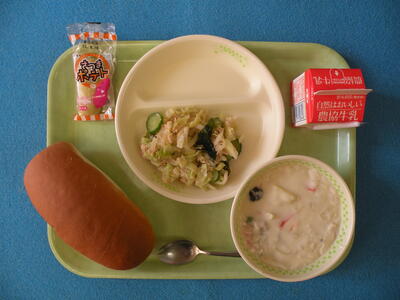 2024年1月30日 12時35分今日のメニューは、コッペパン・ミルクシチュー・海藻サラダ・牛乳・デザートでした。ミルクシチューはとてもコクがあり、美味しかったです。今日はメニューのみの紹介とさせていただきます。