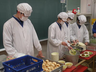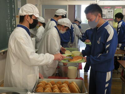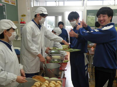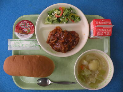 2023年12月21日 12時50分今日のメニューは、減量コッペパン・煮込みハンバーグ・もみの木サラダ・コンソメスープ・ゼリー・牛乳でした。今日は3年生の教室を訪問しました。もうすぐクリスマス、みんなの家はいつケーキを食べるのかな?今学期最後の給食でした!2学期、美味しい給食をご提供いただきまして、ありがとうございました。