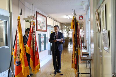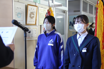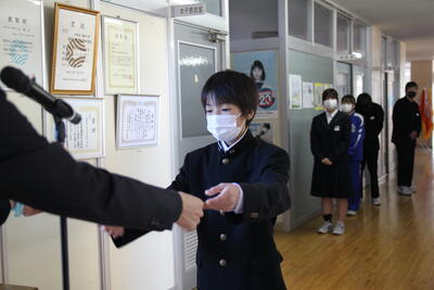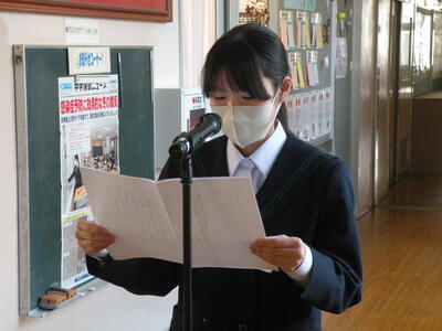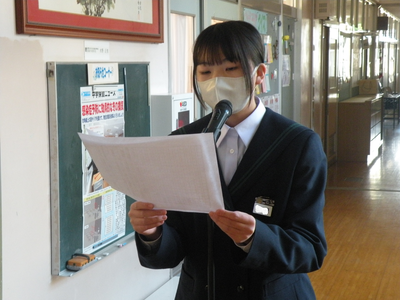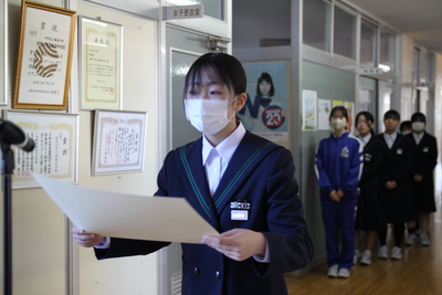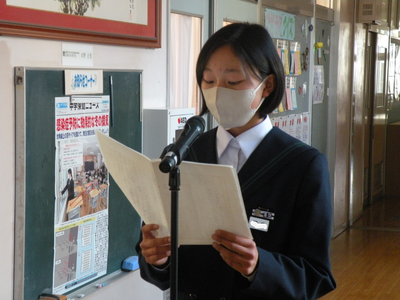 2023年12月22日 12時20分たいへんに冷え込んでいたため、生徒は各教室で、学年代表生徒は放送室前廊下で、終業式を行いました。2学期は1年間で一番長い学期でした。全校生徒一人ひとりがそれぞれの目標達成のため、たいへんに頑張りました。明日からの冬休みも充実した毎日が送れるよう、各ご家庭でのご指導もよろしくお願いいたします。保護者の皆様、たいへんにお世話になりました。