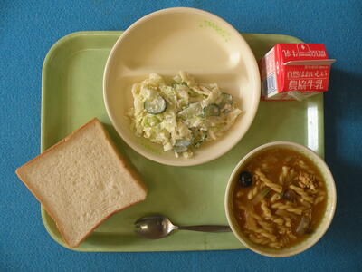 2023年12月7日 12時50分今日のメニューは、食パン・マカロニのカレー煮・チキンサラダ・牛乳でした。今日は1年生の教室を訪問しました。みんな気軽に声を掛けてくれます。心身共に成長している様子がよく理解できます。