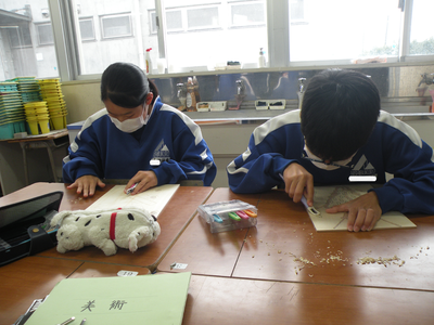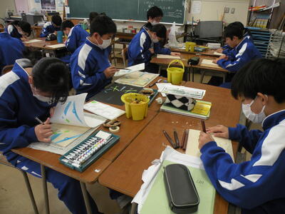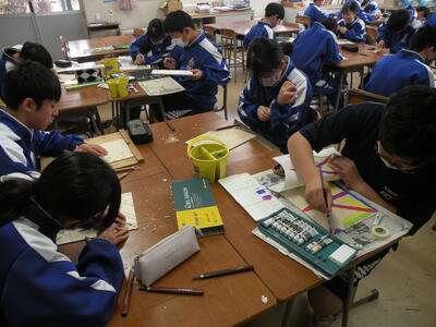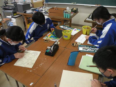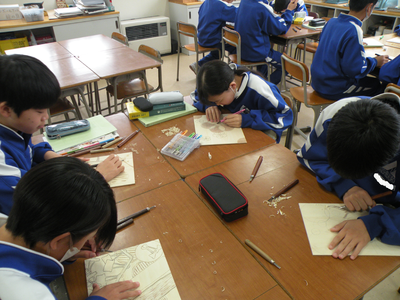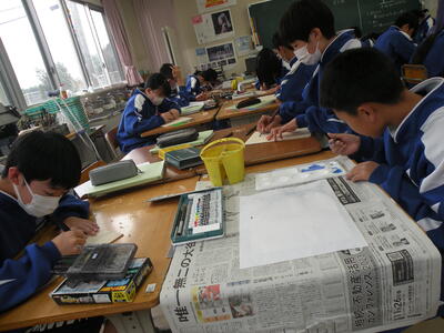 2023年12月5日 10時15分須賀川市出身の銅版画家である亜欧堂田善を目指して、木版画に集中しています。彫っている生徒・色を付けている生徒と、それぞれの作品の完成を目指して、一生懸命に取り組んでいいました。